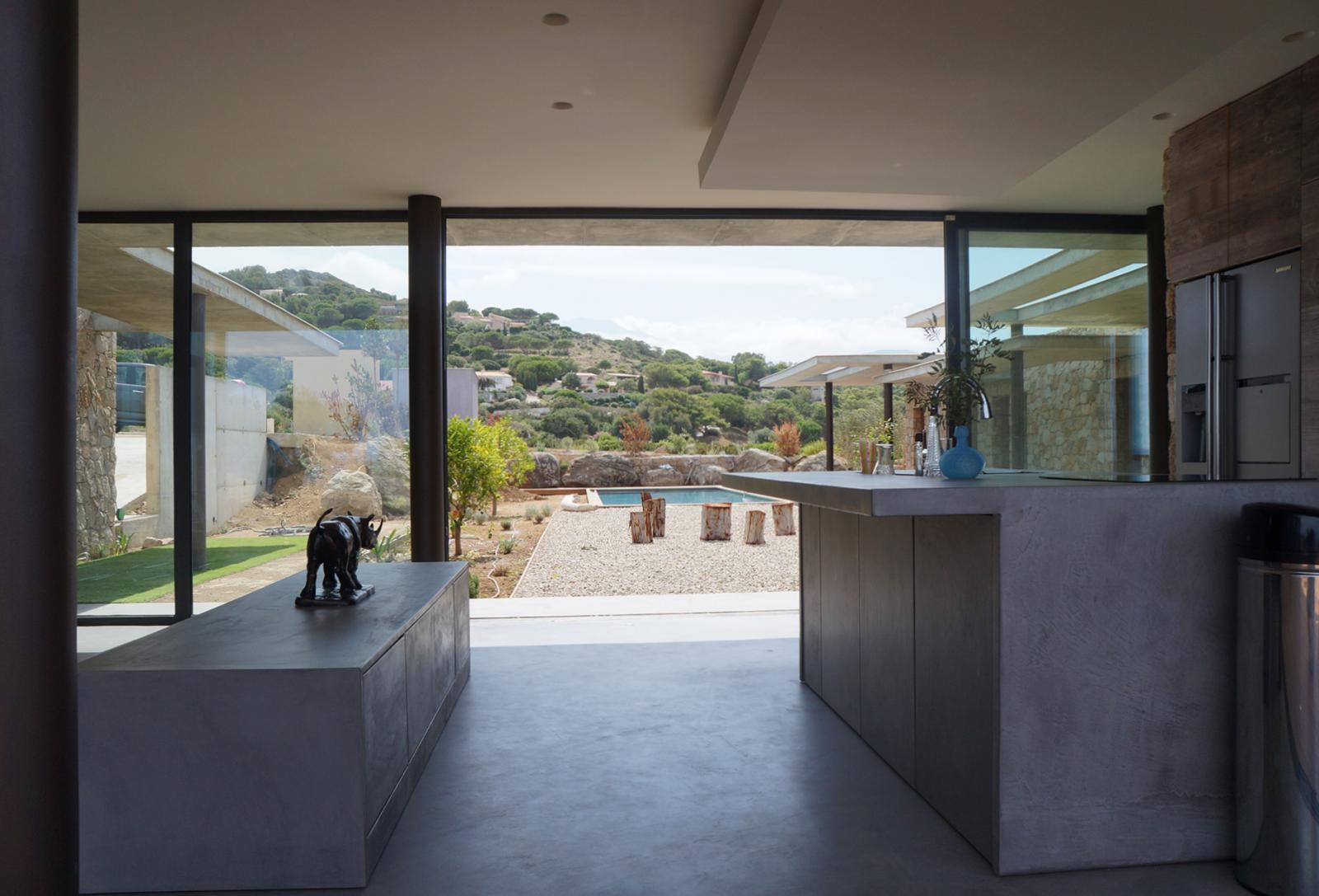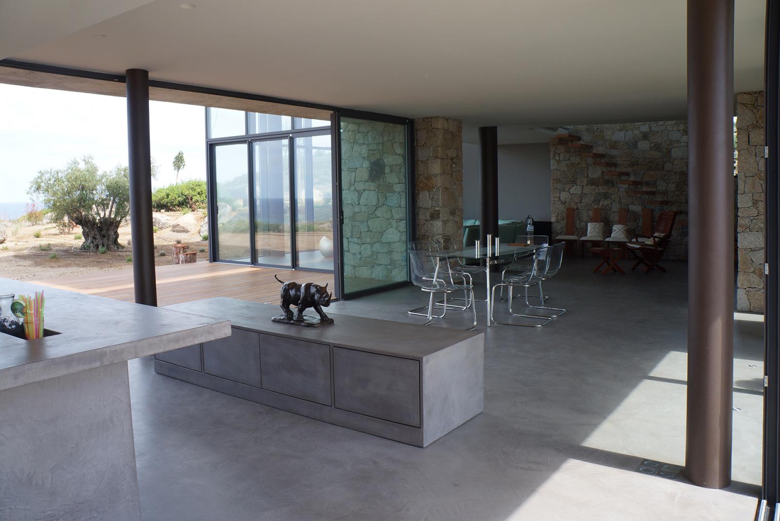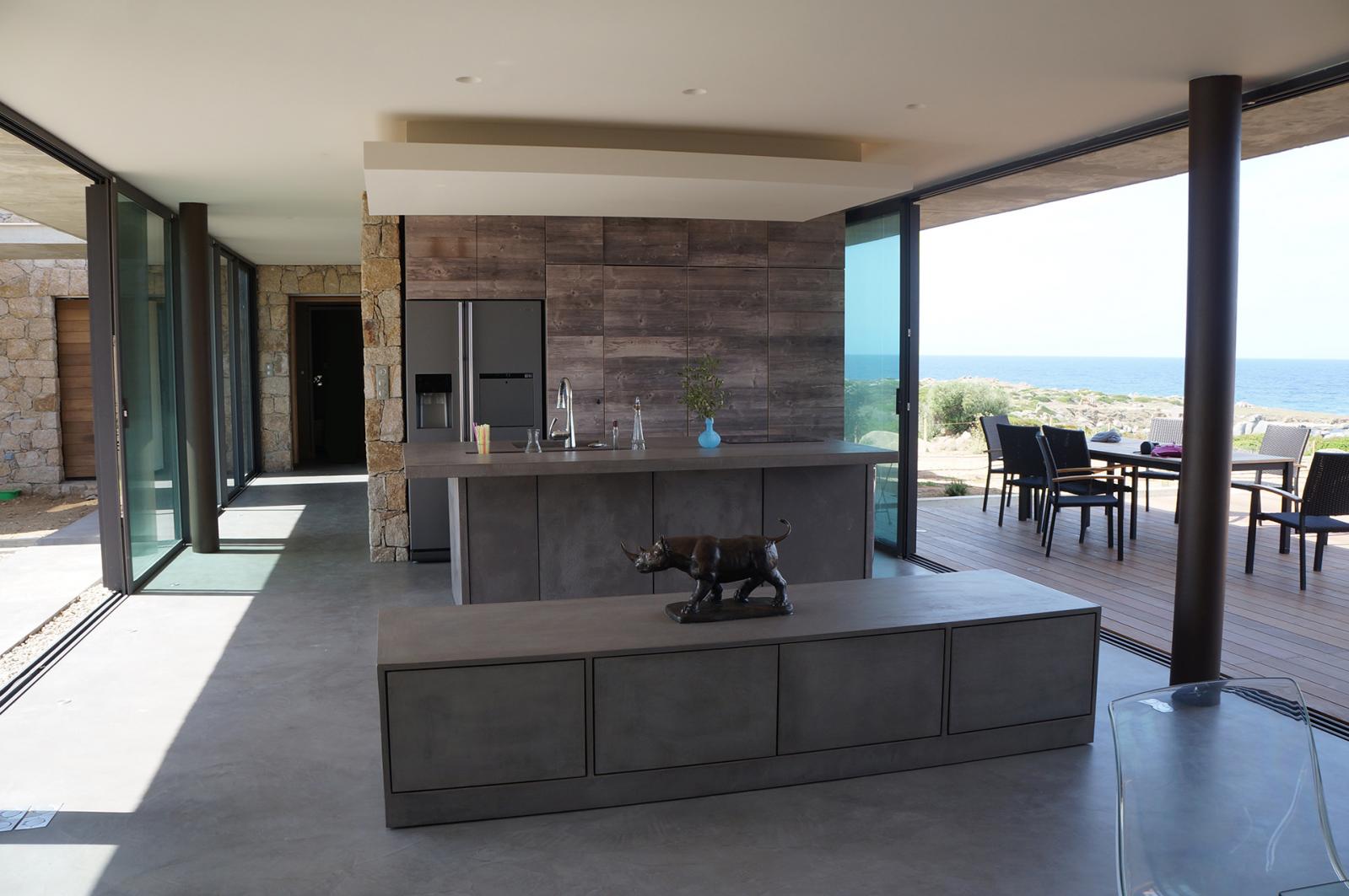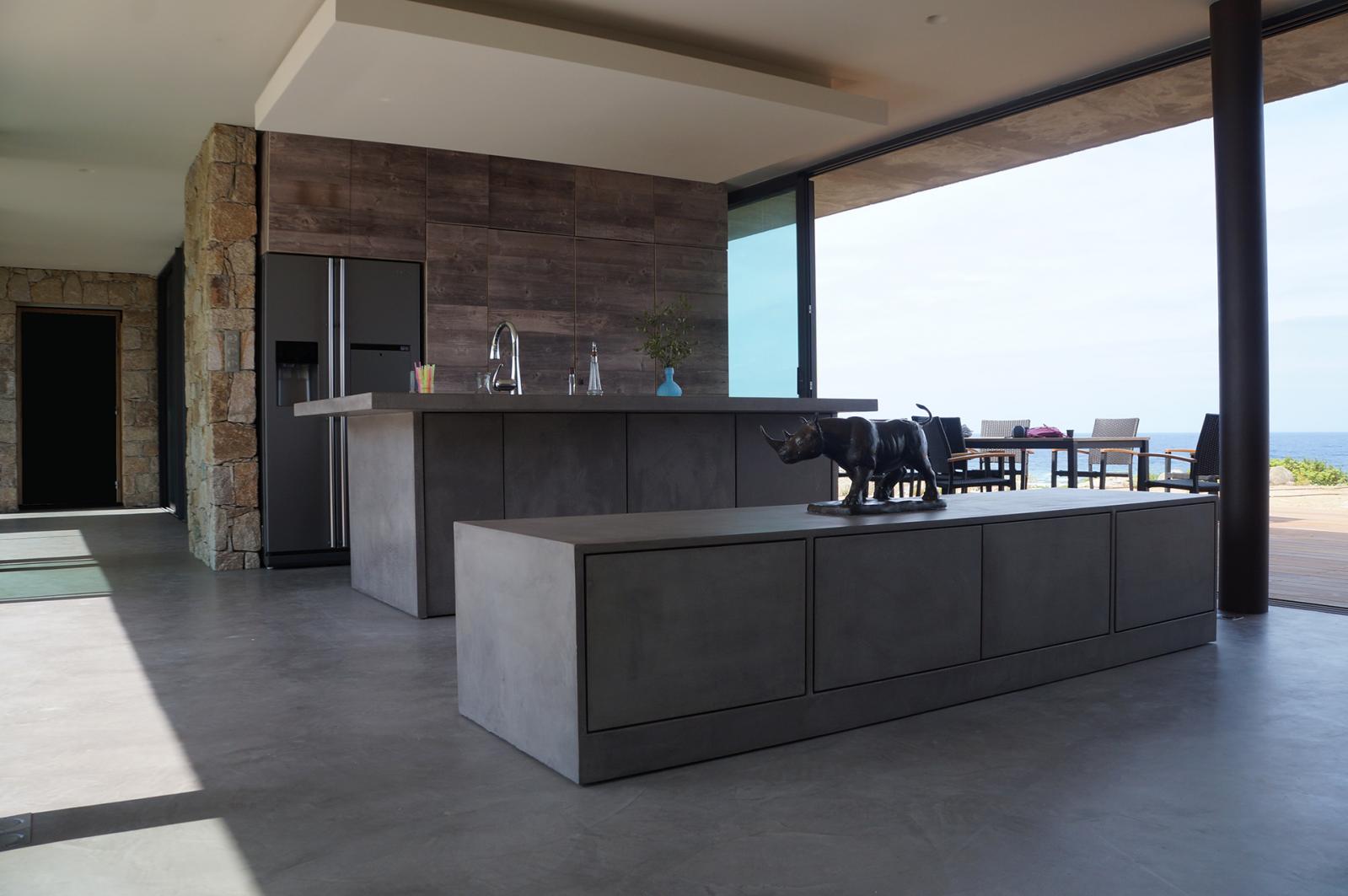 Dans cette villa ou les pièces à vivre se prolongent sur l'extérieur, les sols ont étés realisés en béton ciré. Le mobilier de la cuisine et le meuble qui sépare la cuisine de la salle à manger également. Le béton ciré se poursuit dans les chambres et s'invite dans les douches et les vasques réalisés sur mesure par notre équipe.