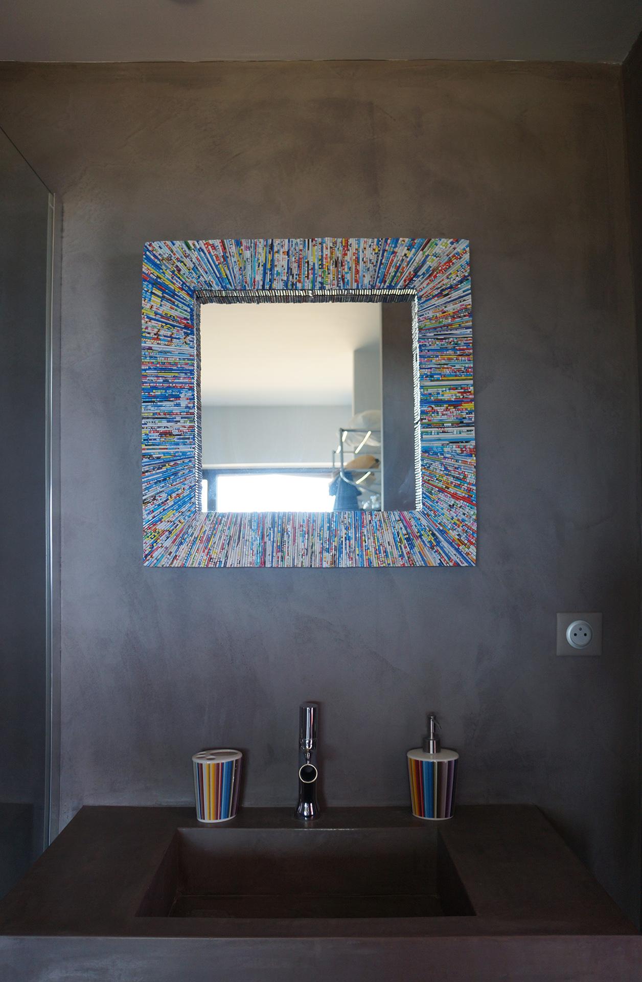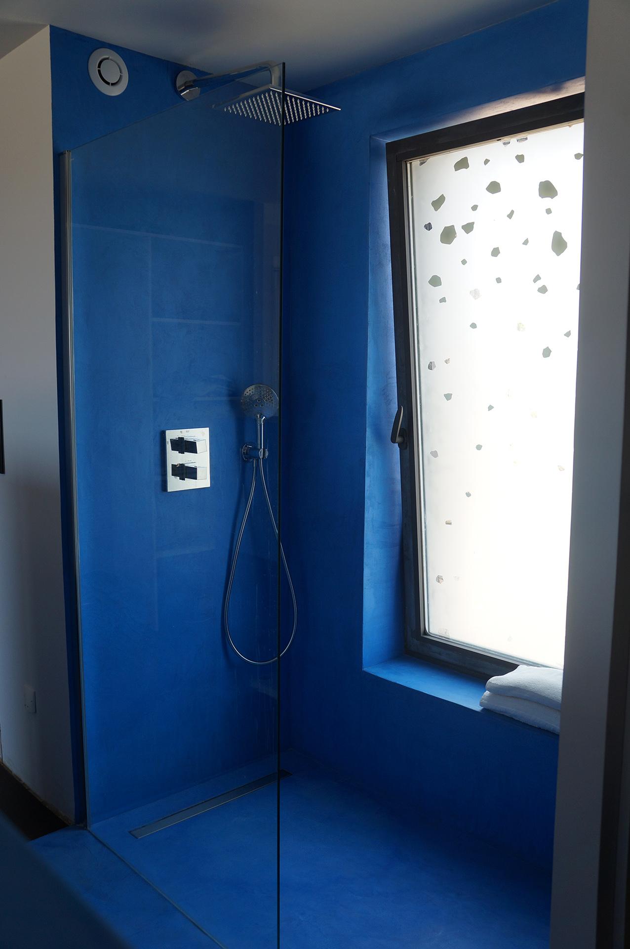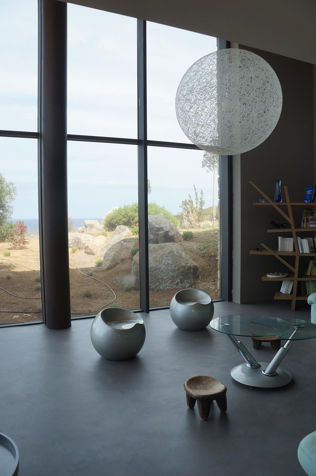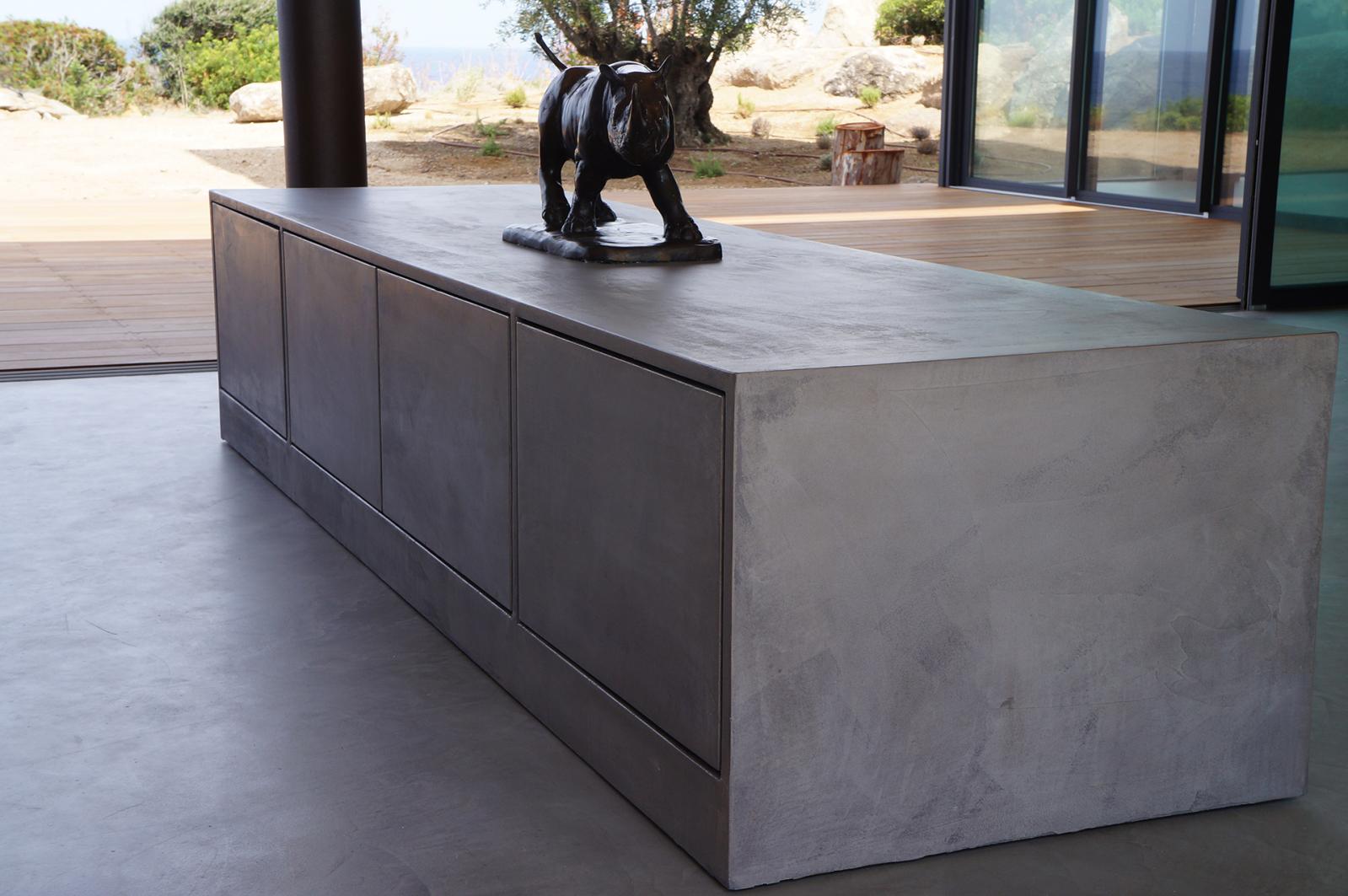 Dans cette villa ou les pièces à vivre se prolongent sur l'extérieur, les sols ont étés realisés en béton ciré. Le mobilier de la cuisine et le meuble qui sépare la cuisine de la salle à manger également. Le béton ciré se poursuit dans les chambres et s'invite dans les douches et les vasques réalisés sur mesure par notre équipe.